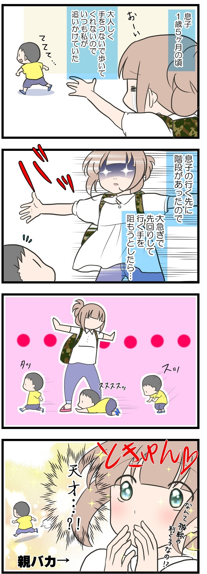 2016年11月18日 【5コマ】親バカフィルター 今から1年以上前のお話です。 まだヨチヨチ歩きの息子が、立ちはだかる私の股の間をくぐるという機転を働かせました…! 初めてのことでビックリ! それを見ていた周囲の方々も、感心しながら笑っていました(笑) でもすぐにハッとして… 運動不足の身体にムチ打って息子 カテゴリ : 子育て