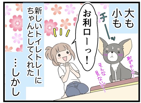 2019年06月13日 22・犬、飼い始めました!(トイレの設置場所の悩み) はじめましての方は→コチラ。第1話はこちら!前回の第21話はこちら!トイレトレーを追加で買いました(笑)(どうしても、シートを掘ったり破いたりしてしまいます(^_^;))ケージ外で過ごす時間を増やすと、まだまだ失敗してしまいます。ケージ外で失敗する場所はだいたい決 カテゴリ : チワワを迎えた話愛犬の避妊手術編