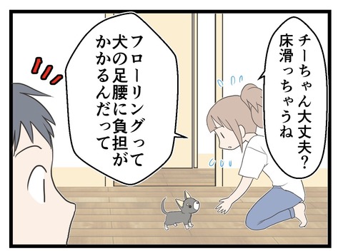 2019年06月12日 21・犬、飼い始めました!(フローリングを滑らないように) はじめましての方は→コチラ。第1話はこちら!前回の第20話はこちら!※絨毯マット⇨タイルカーペット、ジョイントマット夫も子どもたちも、チーを可愛がってくれています。(5歳の息子は、チーに対してちょっと手荒いですがf^_^;)本で、「フローリングは犬の足腰に負担がか カテゴリ : チワワを迎えた話愛犬の避妊手術編